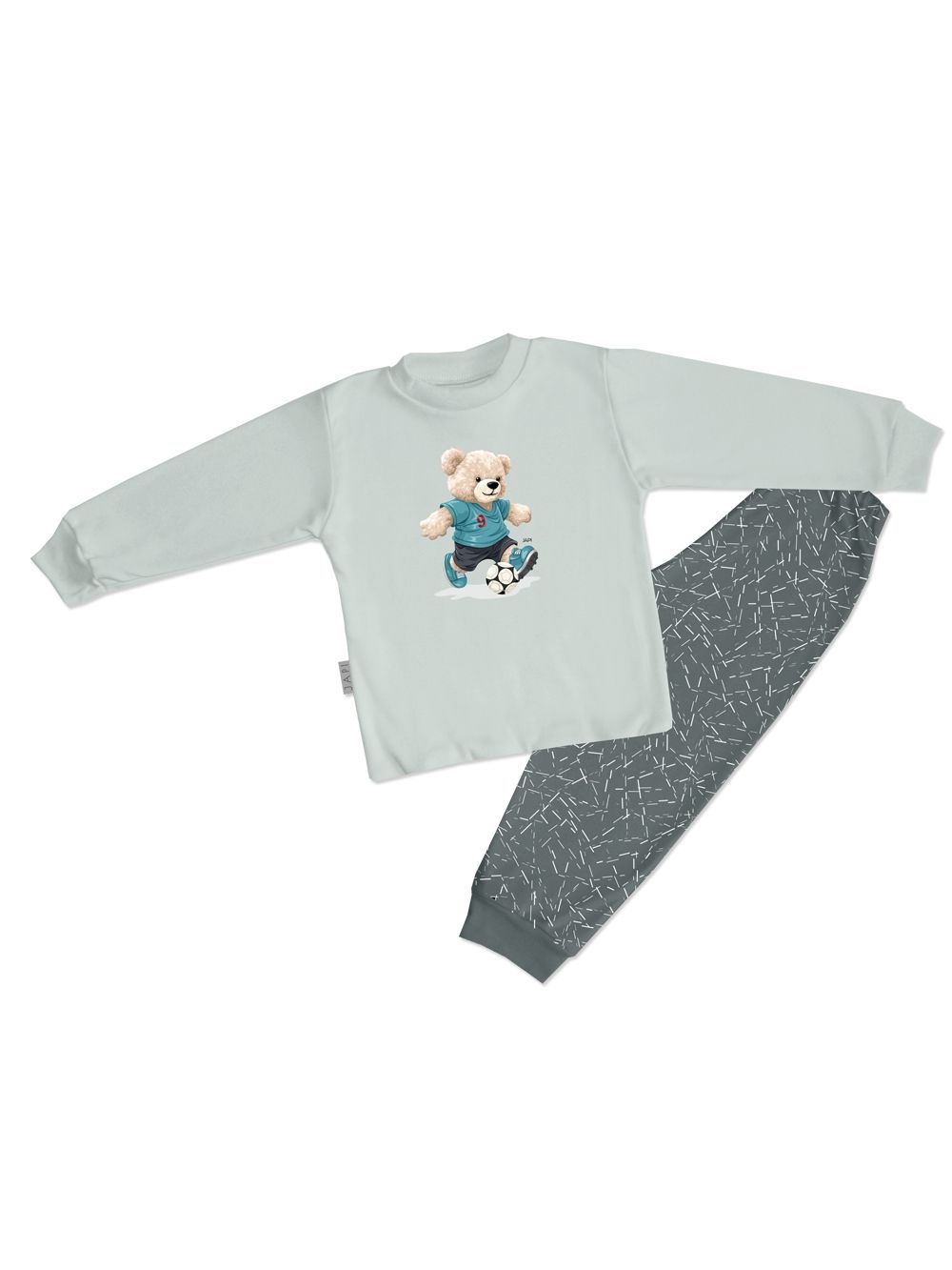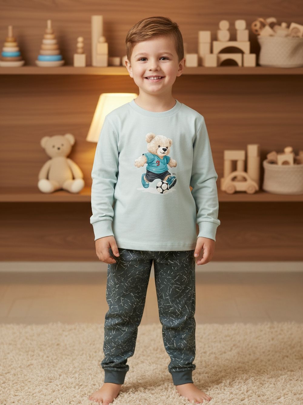 Veselé chlapecké pyžamo s fotbalovým medvídkem GAME je jako stvořené pro malé sportovce. Horní díl pyžama zdobí ilustrace medvídka ve sportovním dresu, který kope do míče – oblíbený motiv u malých fotbalových nadšenců. Vyrobeno z kvalitní bavlny, je příjemné na dotek a zajišťuje pohodlí po celou noc. Tmavě šedé kalhoty s jemným vzorem a elastickým pasem jsou pohodlné a dobře sedí. Dětské pyžamo pro chlapce má dlouhé rukávy a nohavice, které udrží teplo i během chladnějších nocí. Střih je navržen tak, aby neomezoval pohyb a zajistil klidný spánek.