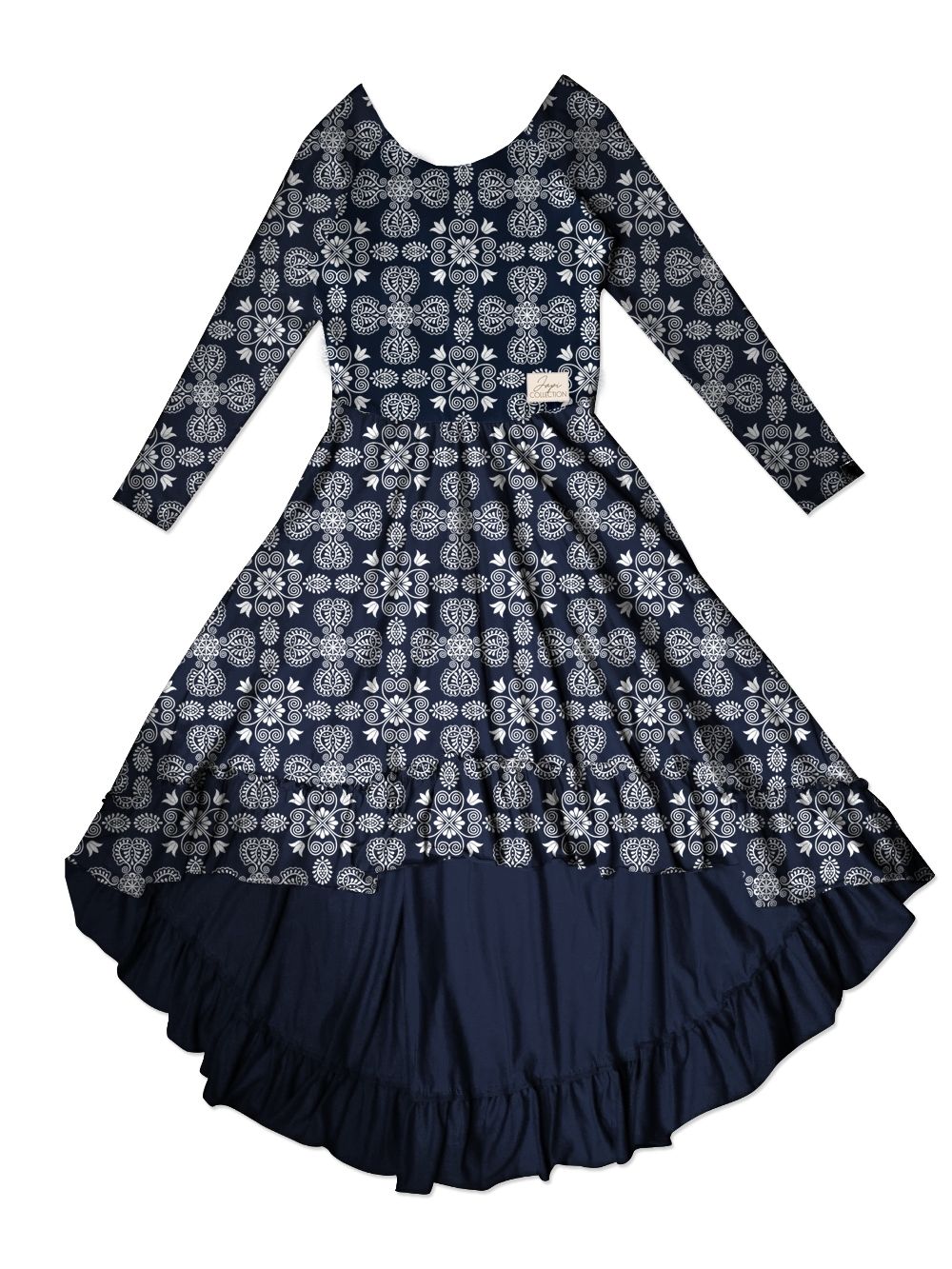 Šaty jsme ušili z látky, kterou jsme si sami navrhli. Vycházeli jsme z lidové výšivky, kterou jsme zpracovali. Na tmavomodrém a bordó podkladu se krásně vyjímá bílý lidový vzor. Šaty s dlouhým rukávem jsou v pase přestřižené a mají oblý výstřih. Sukně je vzadu prodloužená a tvoří jakoby vlečku. Působí velmi elegantně a moderně. Sukně mě na spodní části našitý volán, což z ní činí bohatou součást.