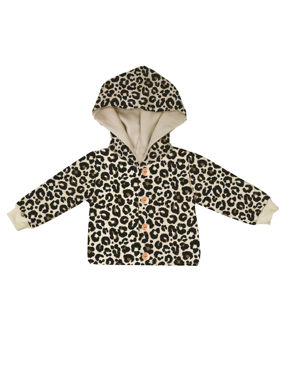 Tato stylová dětská mikina s kapucí a leopardím vzorem je jako stvořená pro malé dobrodruhy. Mikina je ušita z příjemného materiálu, který je měkký na dotek a zároveň prodyšný, takže zajišťuje celodenní pohodlí. Kapuce s podšívkou poskytuje extra ochranu před větrem a chladem, zatímco praktické zapínání na dřevěné knoflíky usnadňuje oblékání. Elastické manžety na rukávech zaručují, že mikina dobře sedí a nevytahuje se. Výrazný leopardí vzor dodává outfitu hravost a originalitu. Skvělá volba na podzimní procházky, výlety nebo jen tak – pro každodenní nošení s výrazným stylem.