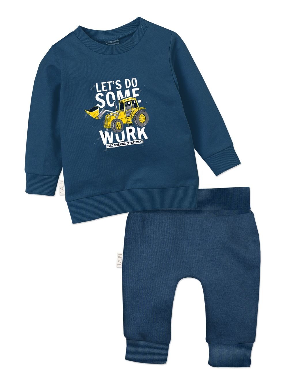 Tato dětská souprava WORK je praktickým a pohodlným řešením pro aktivní děti. Obsahuje měkký pulovr s potiskem stavebního stroje a nápisem, který zaujme každého malého stavitele. Pružné manžety na rukávech i nohavicích zajišťují pohodlné nošení a perfektní držení na místě. Kalhoty mají elastický pas, díky kterému se snadno oblékají a skvěle sedí.