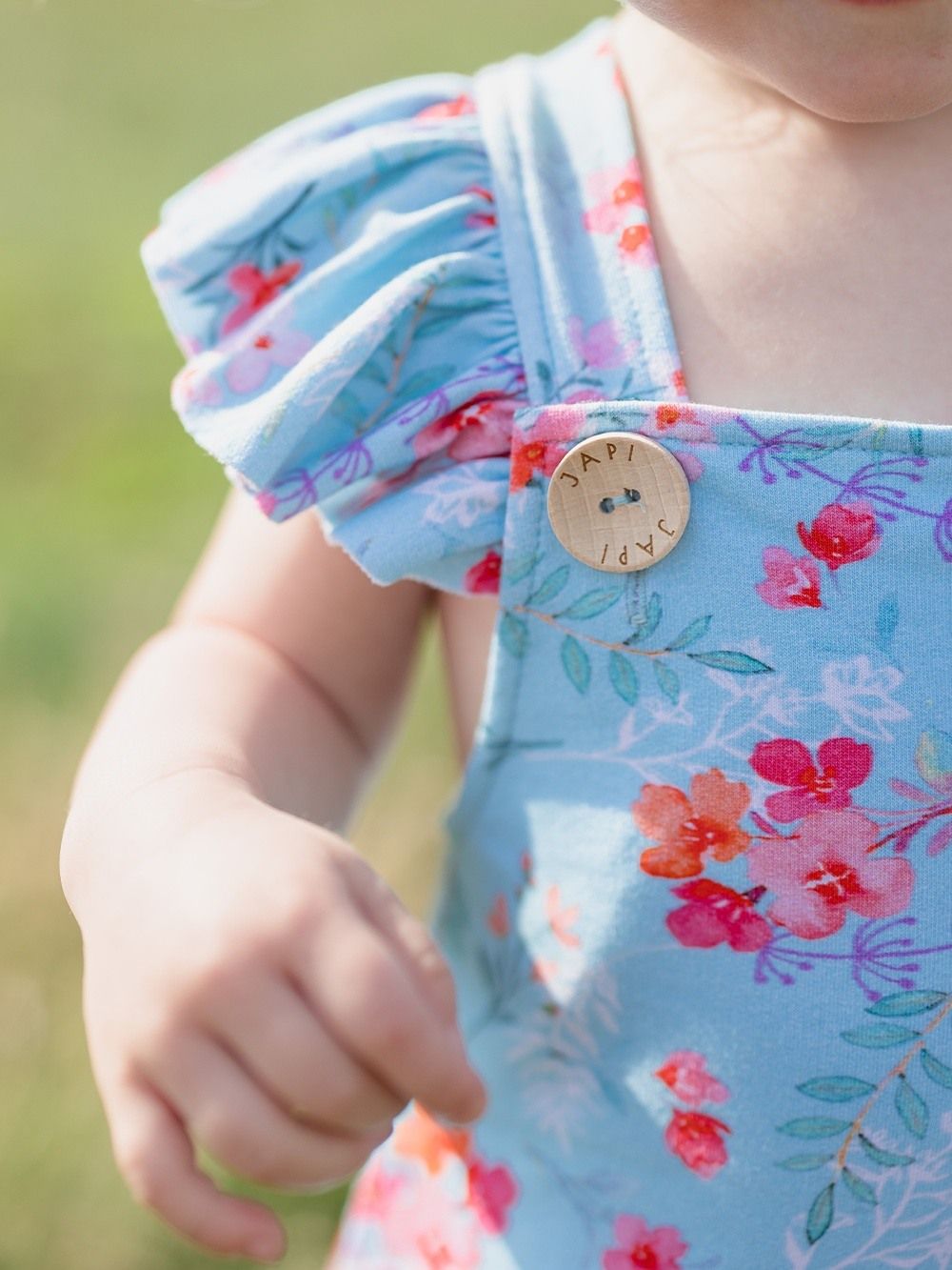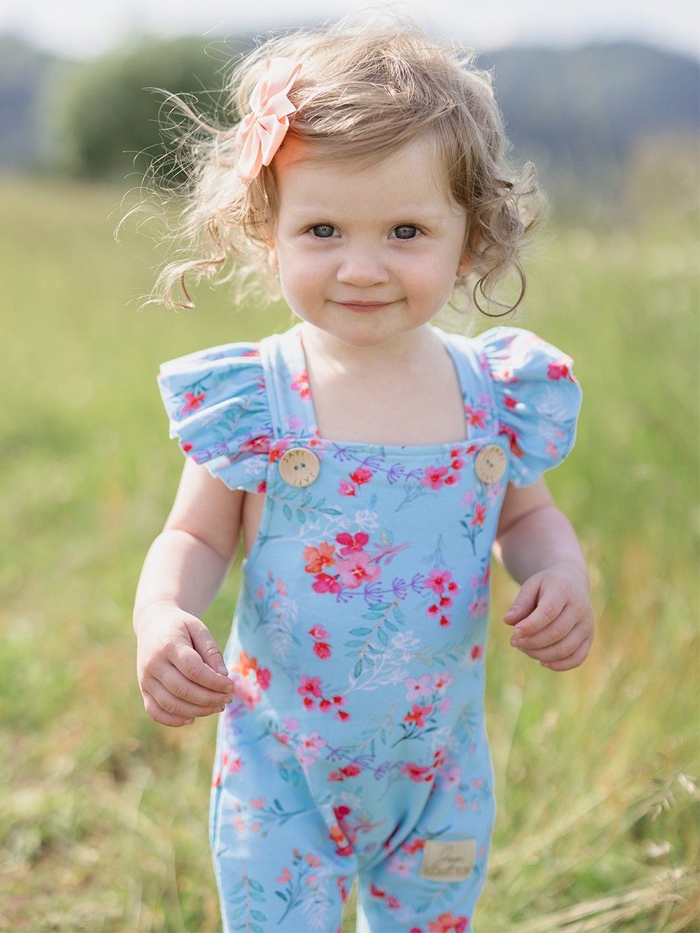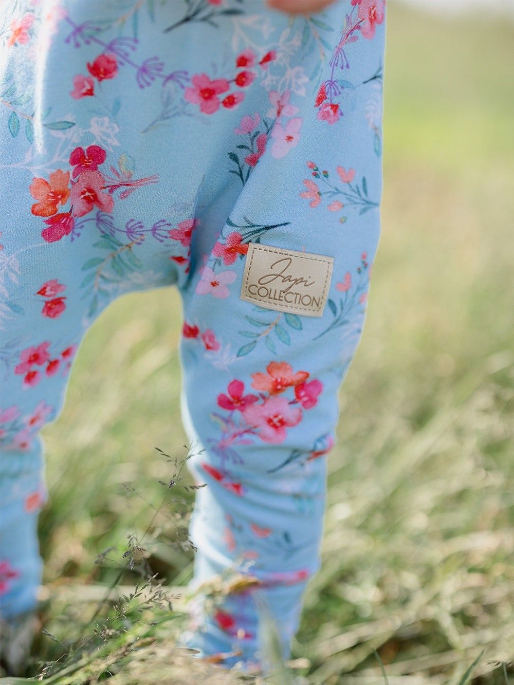 Pohodlné teplákové kalhoty na kšandy, které využijete pro každý den i pro slavnostní příležitosti. Tepláky jsme ušili z příjemné bavlněné látky s certifikátem, a tak jsou vhodné pro děti již od narození. Střih je přizpůsoben i dětičkám s plenou. Zapínání je na kšandy, na přední části díky dřevěným knoflíkům, které dodávají tomuto kousku jedinečný vzhled. Na světle modrém podkladu jsou natištěny jemné květiny. Tepláky mají širší elastické náplety na spodní části, a tak děti netlačí, ale drží na místě.