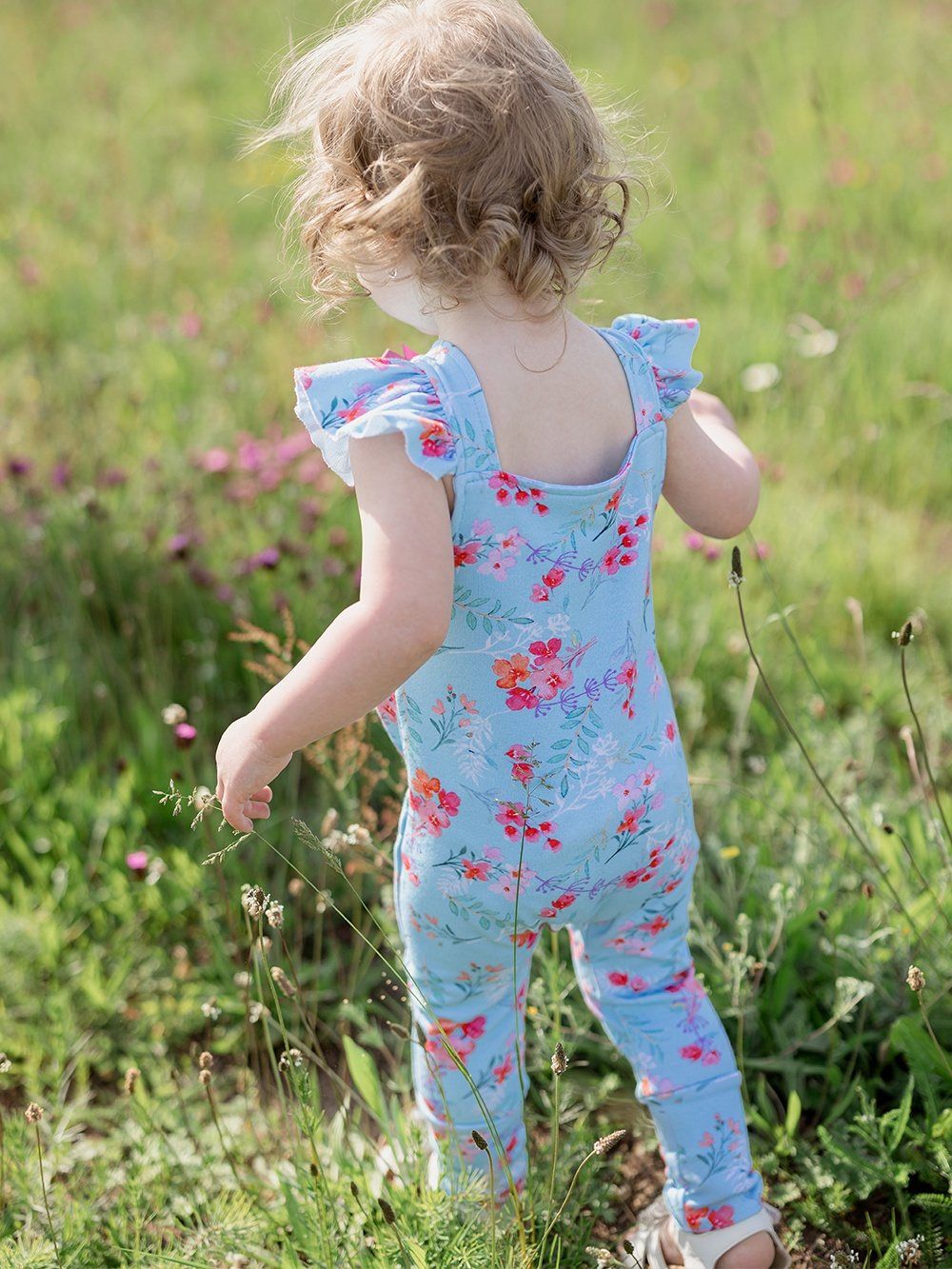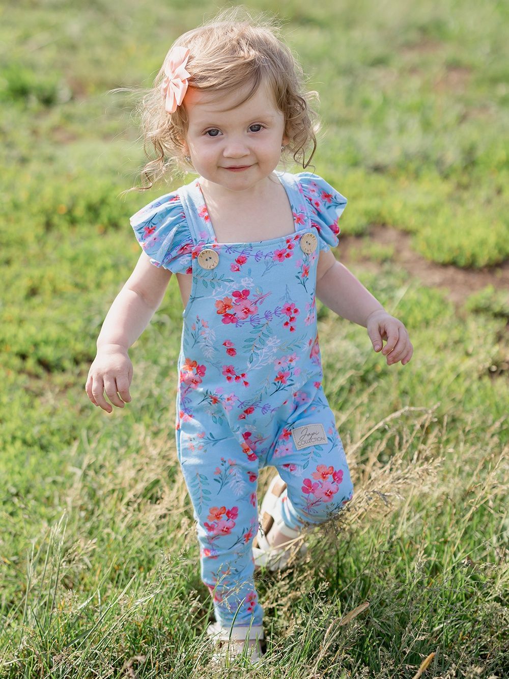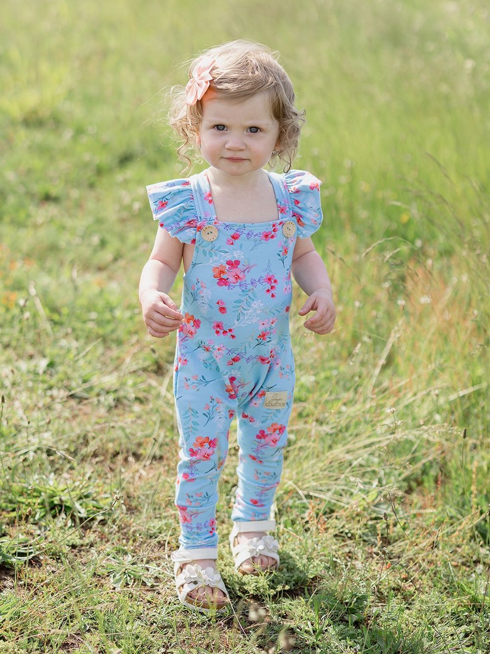 Pohodlné teplákové kalhoty na kšandy, které využijete pro každý den i pro slavnostní příležitosti. Tepláky jsme ušili z příjemné bavlněné látky s certifikátem, a tak jsou vhodné pro děti již od narození. Střih je přizpůsoben i dětičkám s plenou. Zapínání je na kšandy, na přední části díky dřevěným knoflíkům, které dodávají tomuto kousku jedinečný vzhled. Na světle modrém podkladu jsou natištěny jemné květiny. Tepláky mají širší elastické náplety na spodní části, a tak děti netlačí, ale drží na místě.