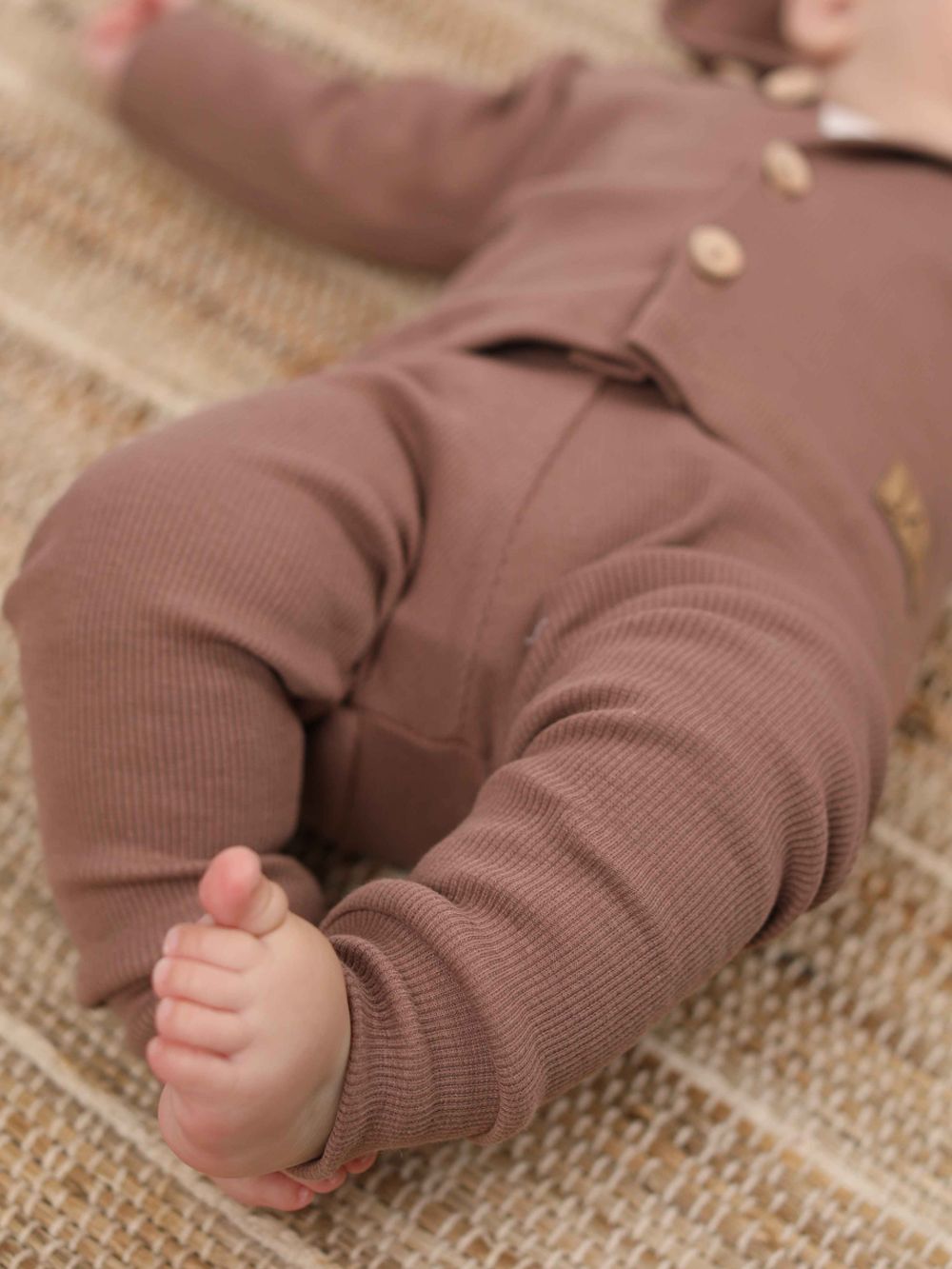 Tepláky na kšandy jsou ušity ze 100% bavlněné látky s vroubky. Mají velmi pohodlný střih a spolu s dětským tričkem nebo body vytvoříte sladěnou sadu oblečení.