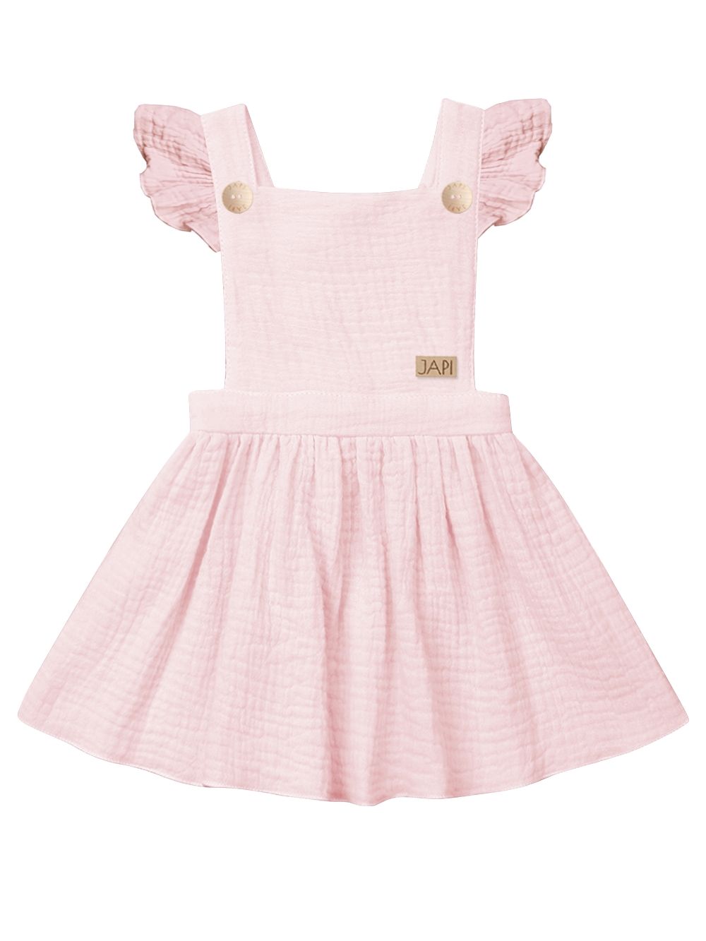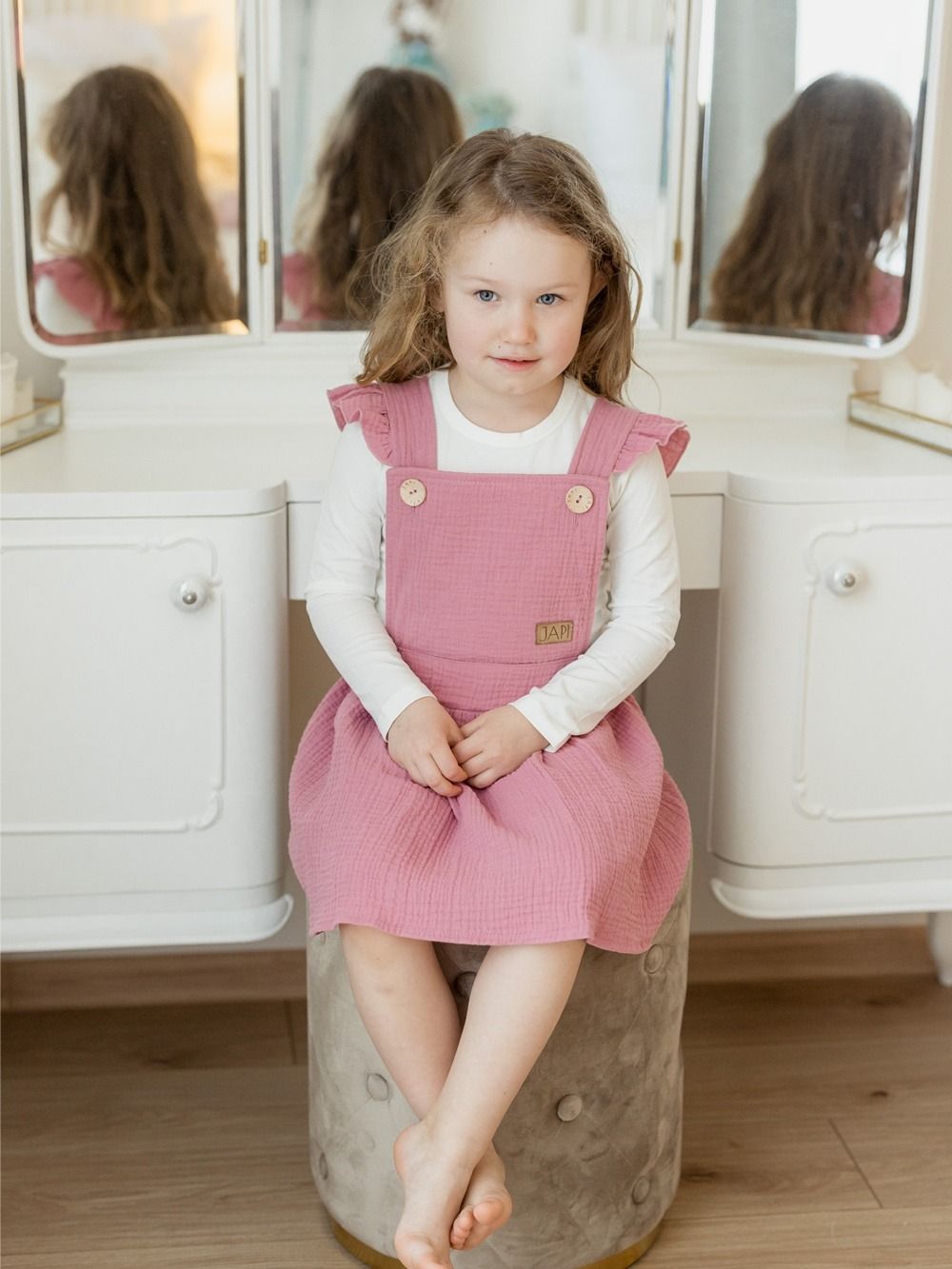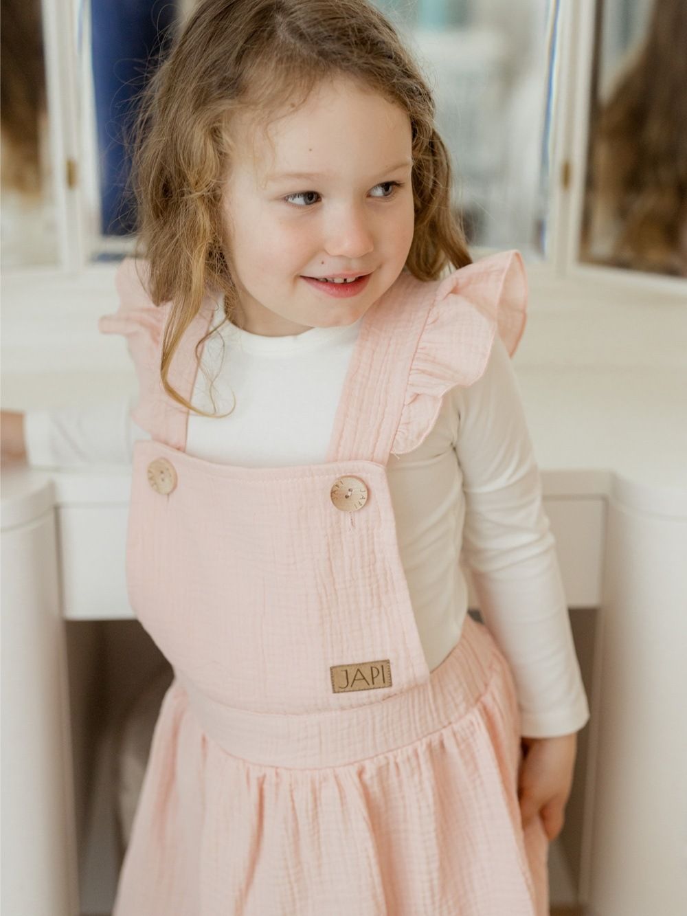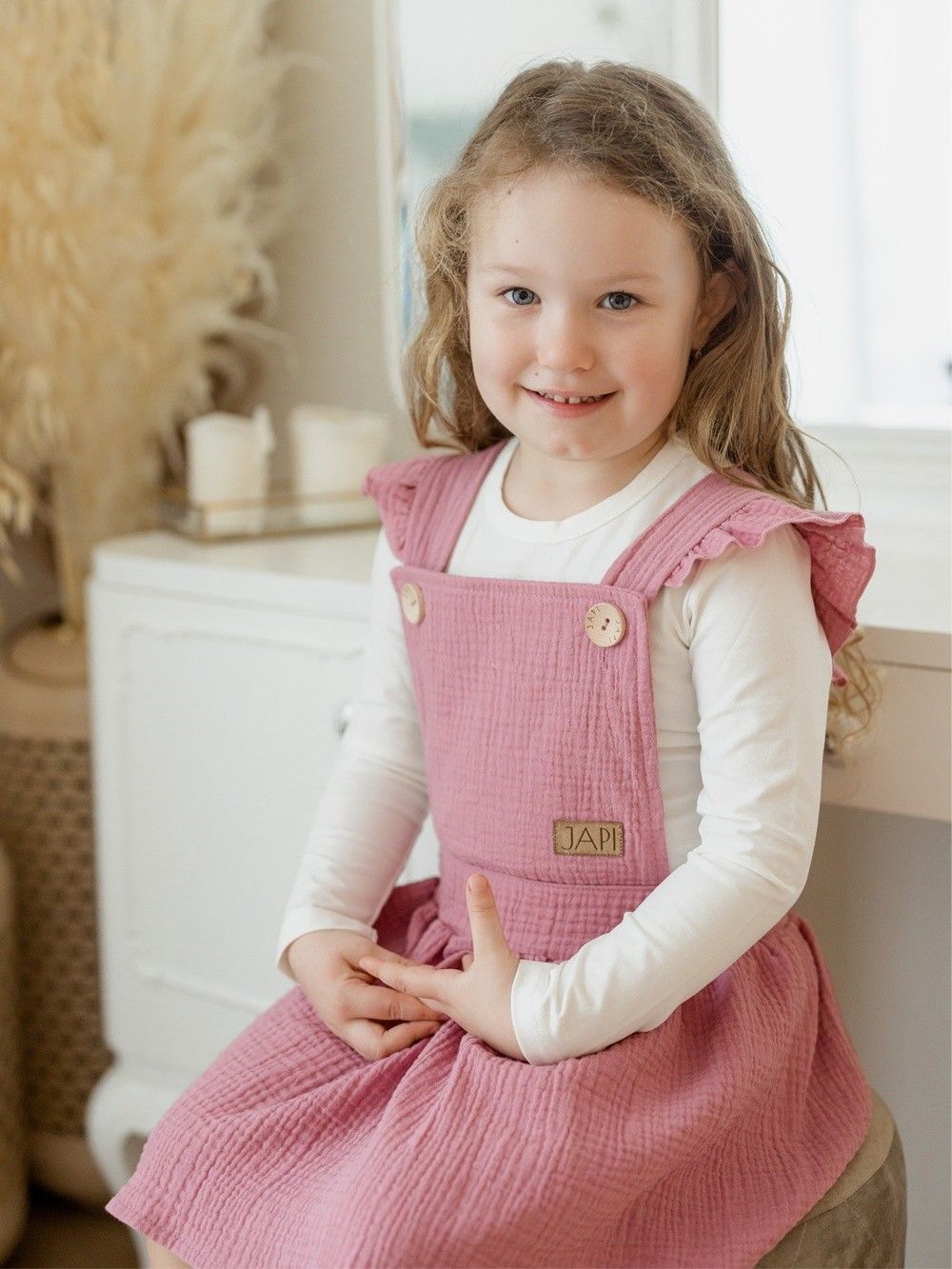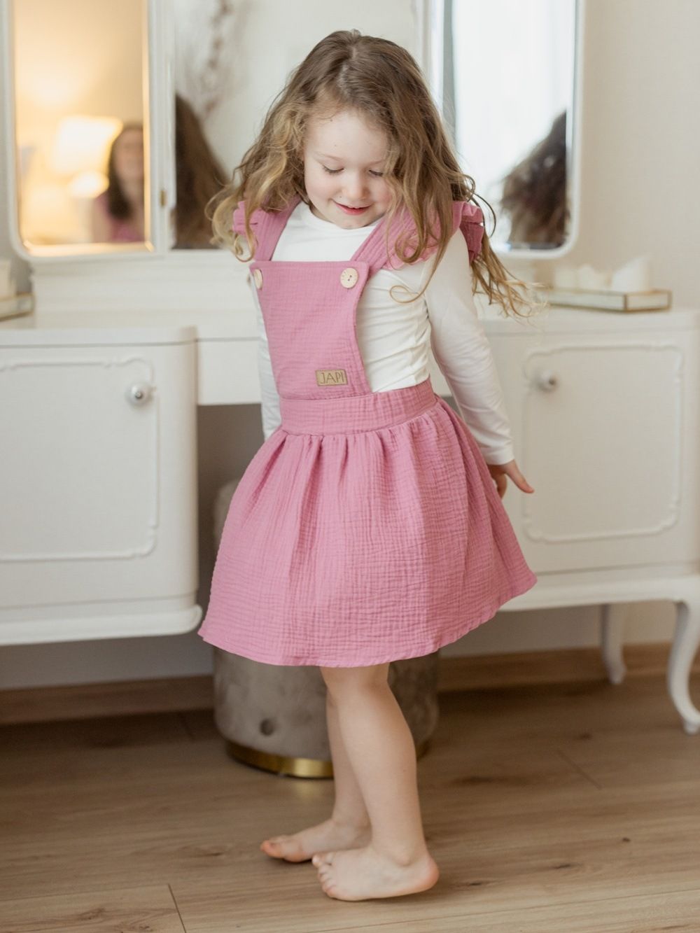 Sukýnka, kterou si dívky zamilují. Šle jsou doplněny o milé volánky. Zapínání je na předním díle na dřevěné knoflíky. Sukýnka je řasená, aby se krásně zatočila. Naleznete ji v jemné růžové i tmavší fialové barvě.