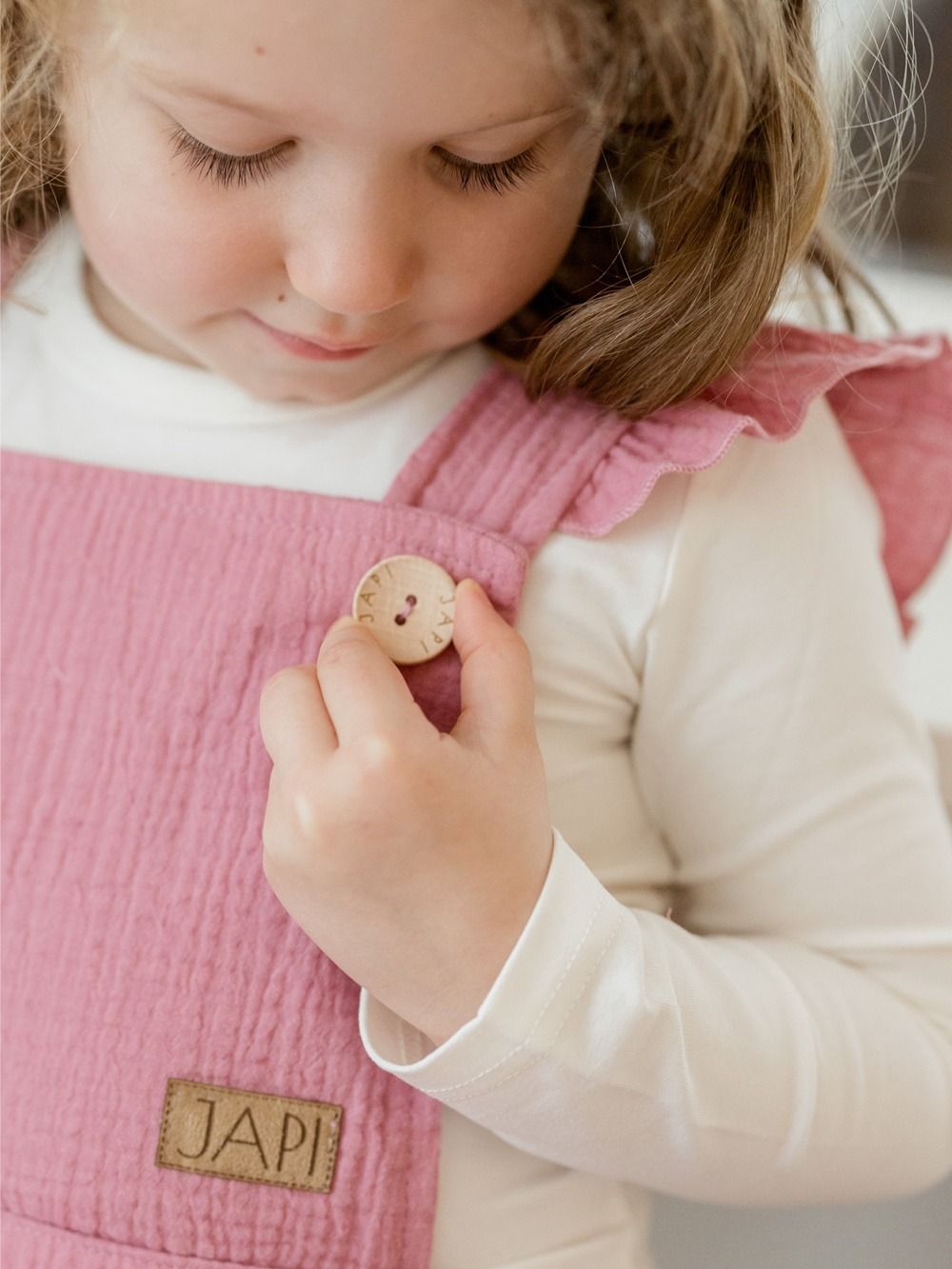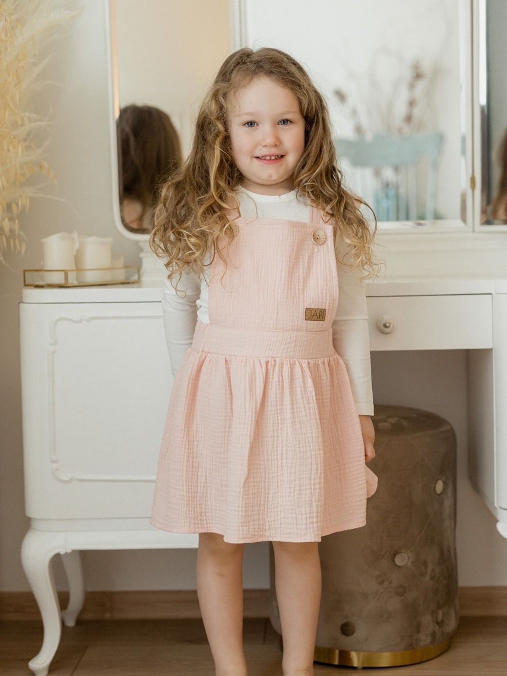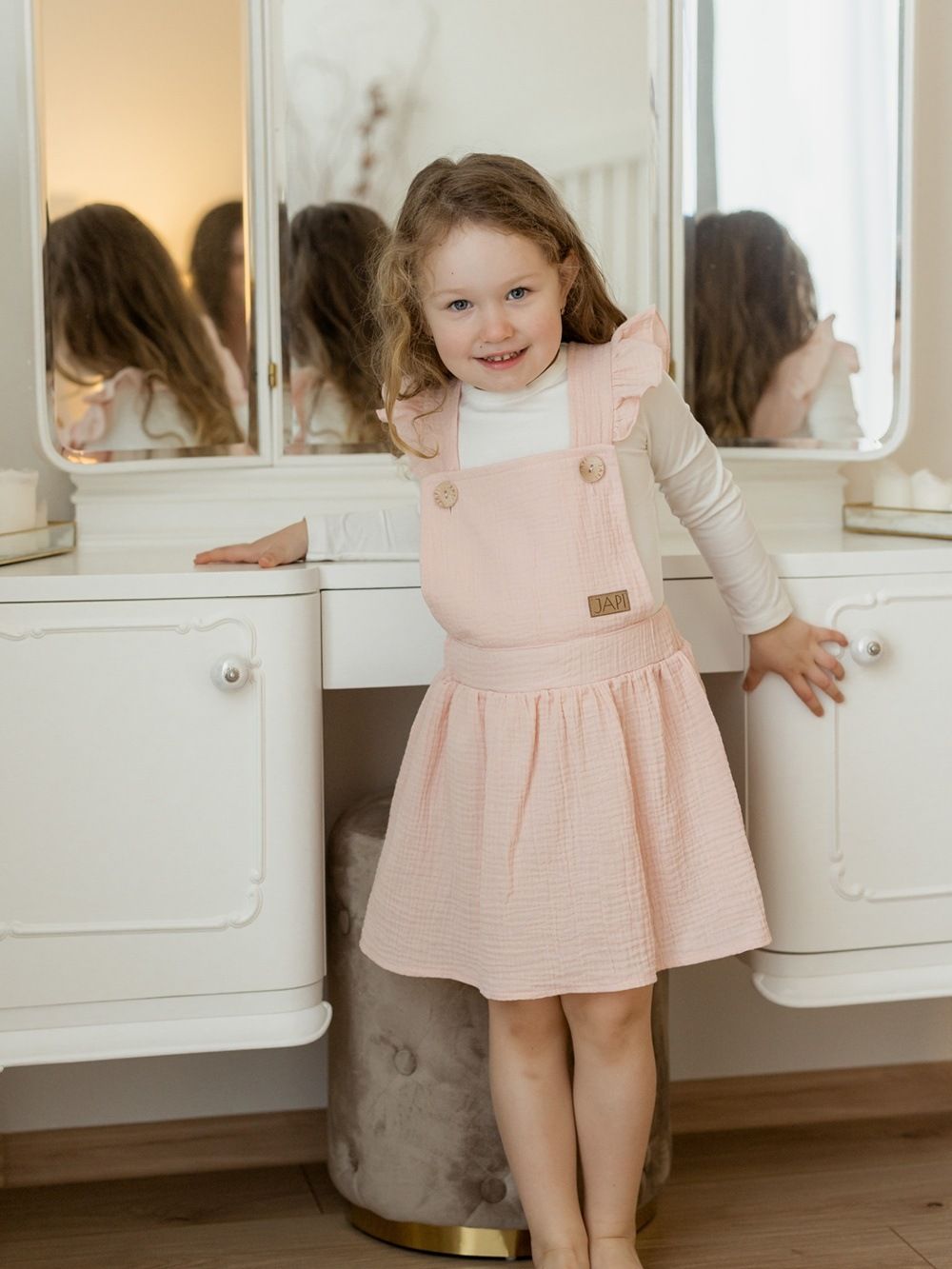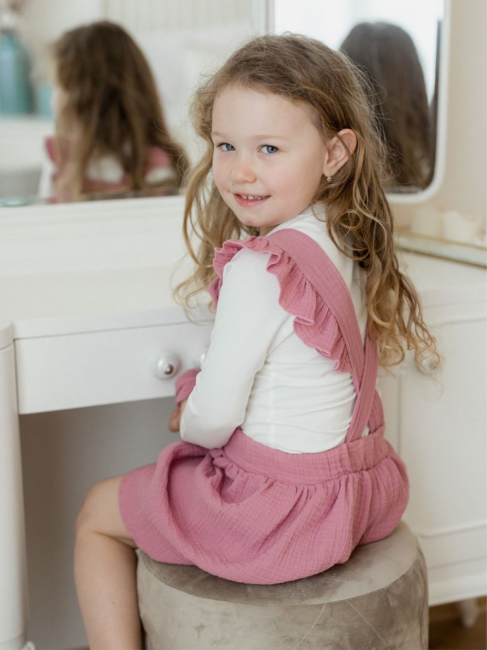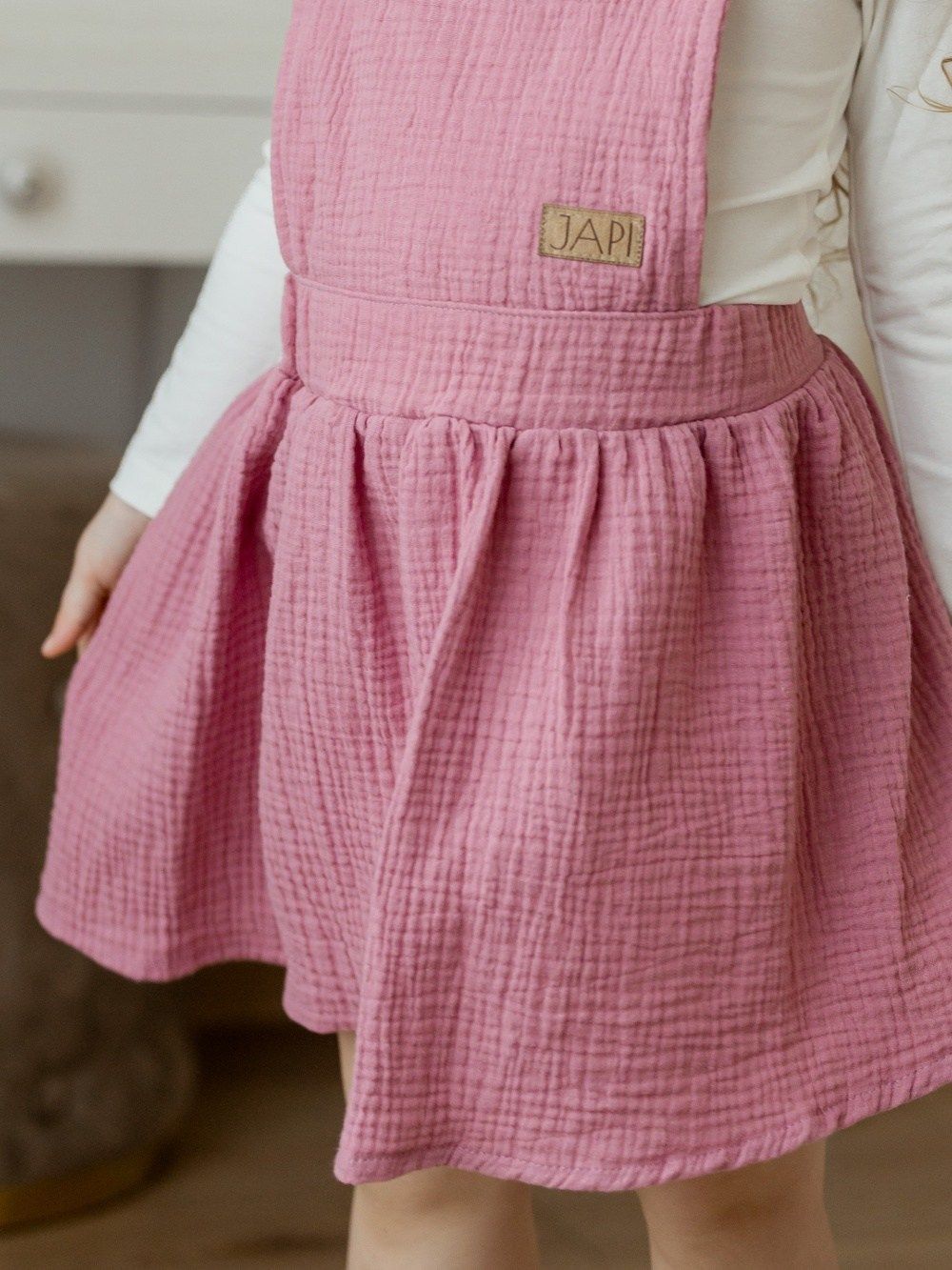 Sukýnka, kterou si dívky zamilují. Šle jsou doplněny o milé volánky. Zapínání je na předním díle na dřevěné knoflíky. Sukýnka je řasená, aby se krásně zatočila. Naleznete ji v jemné růžové i tmavší fialové barvě.