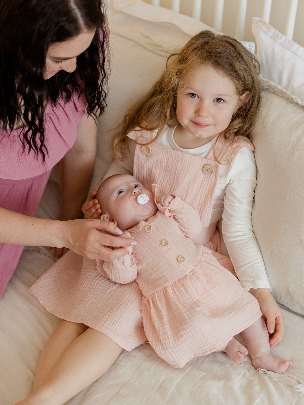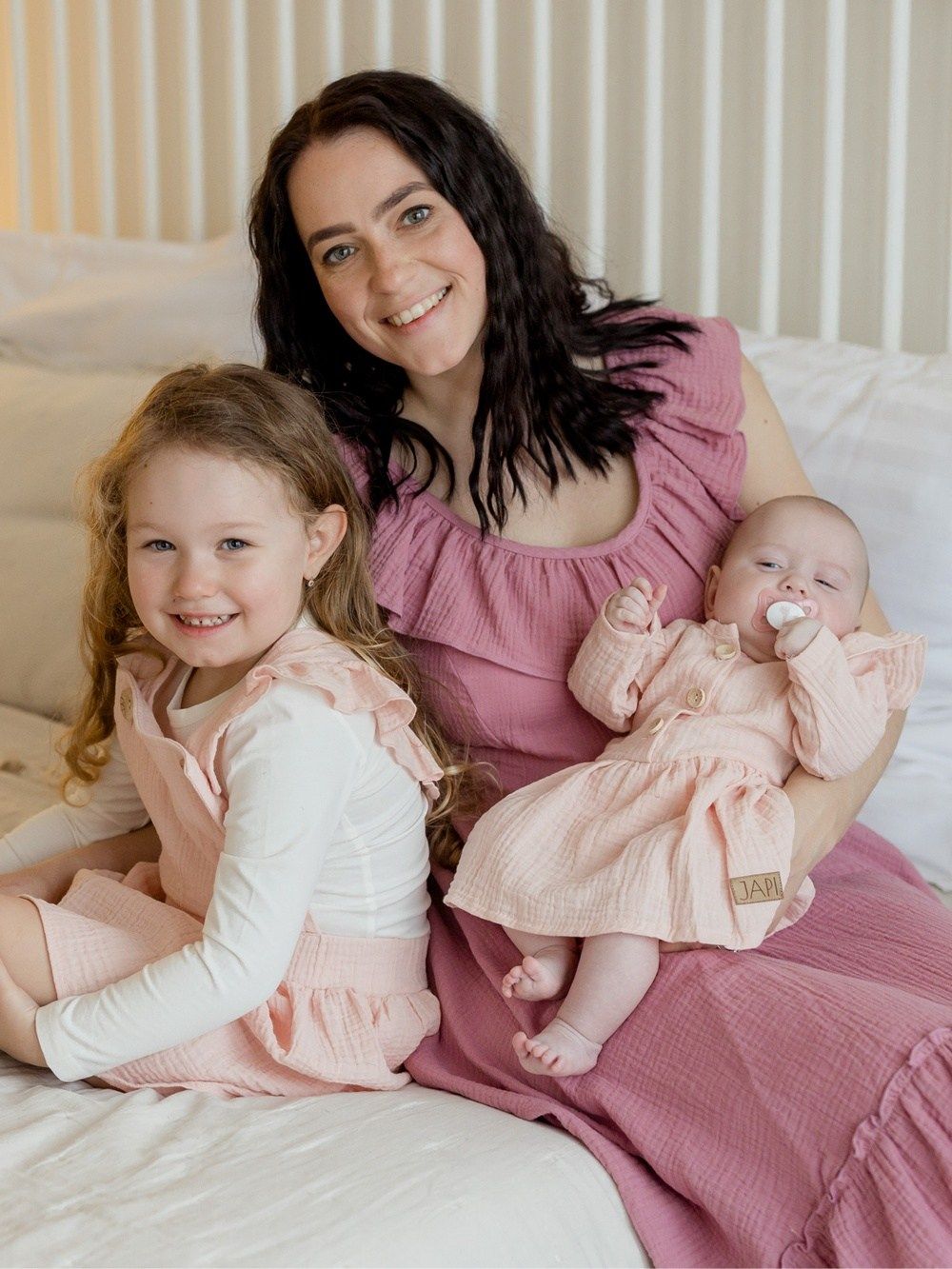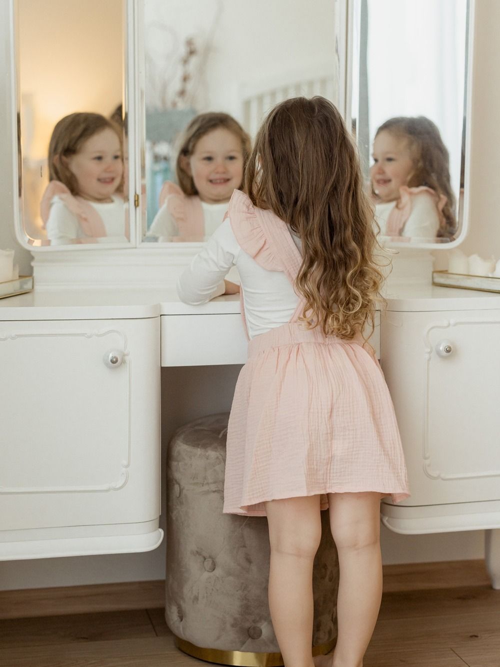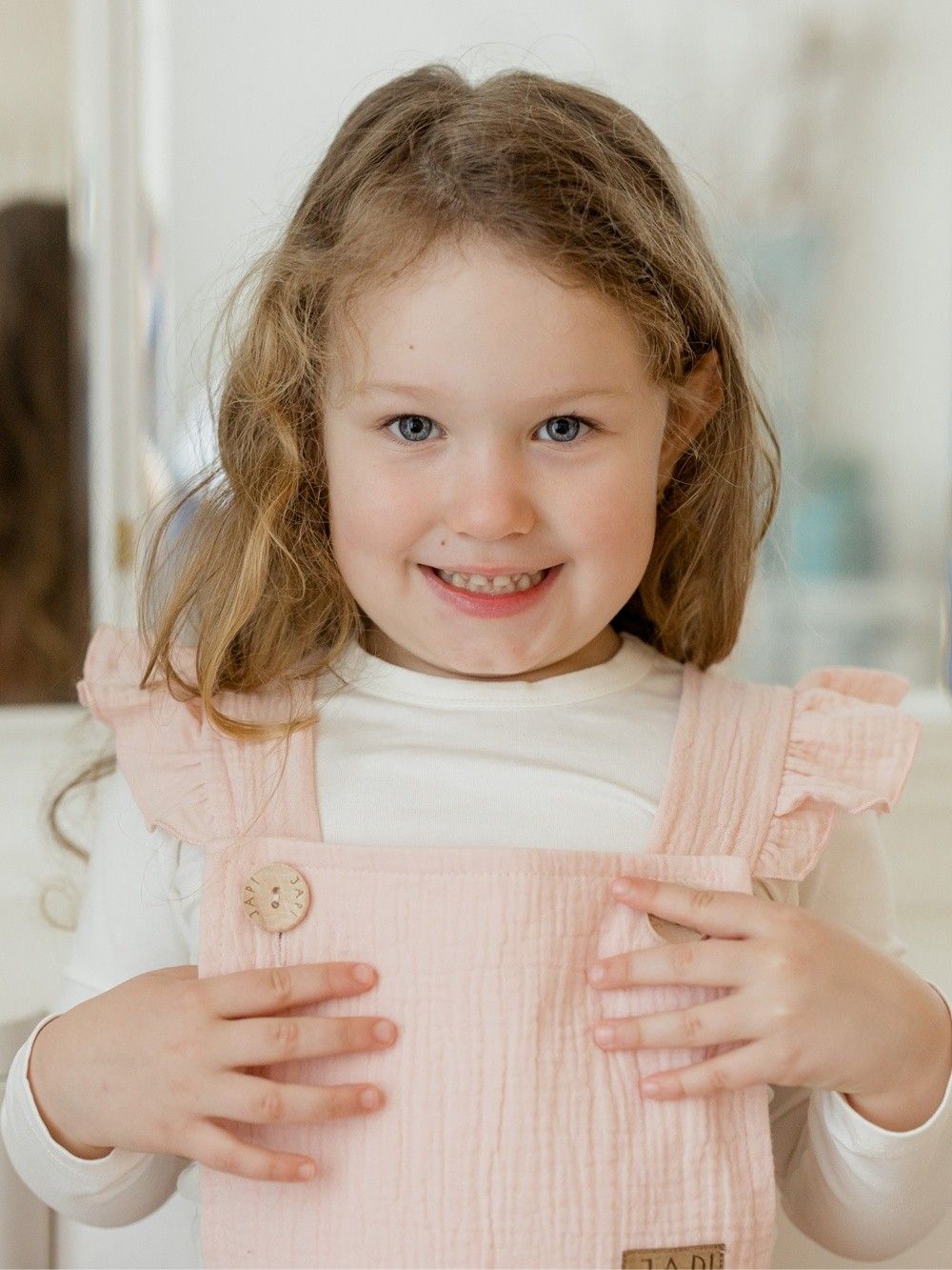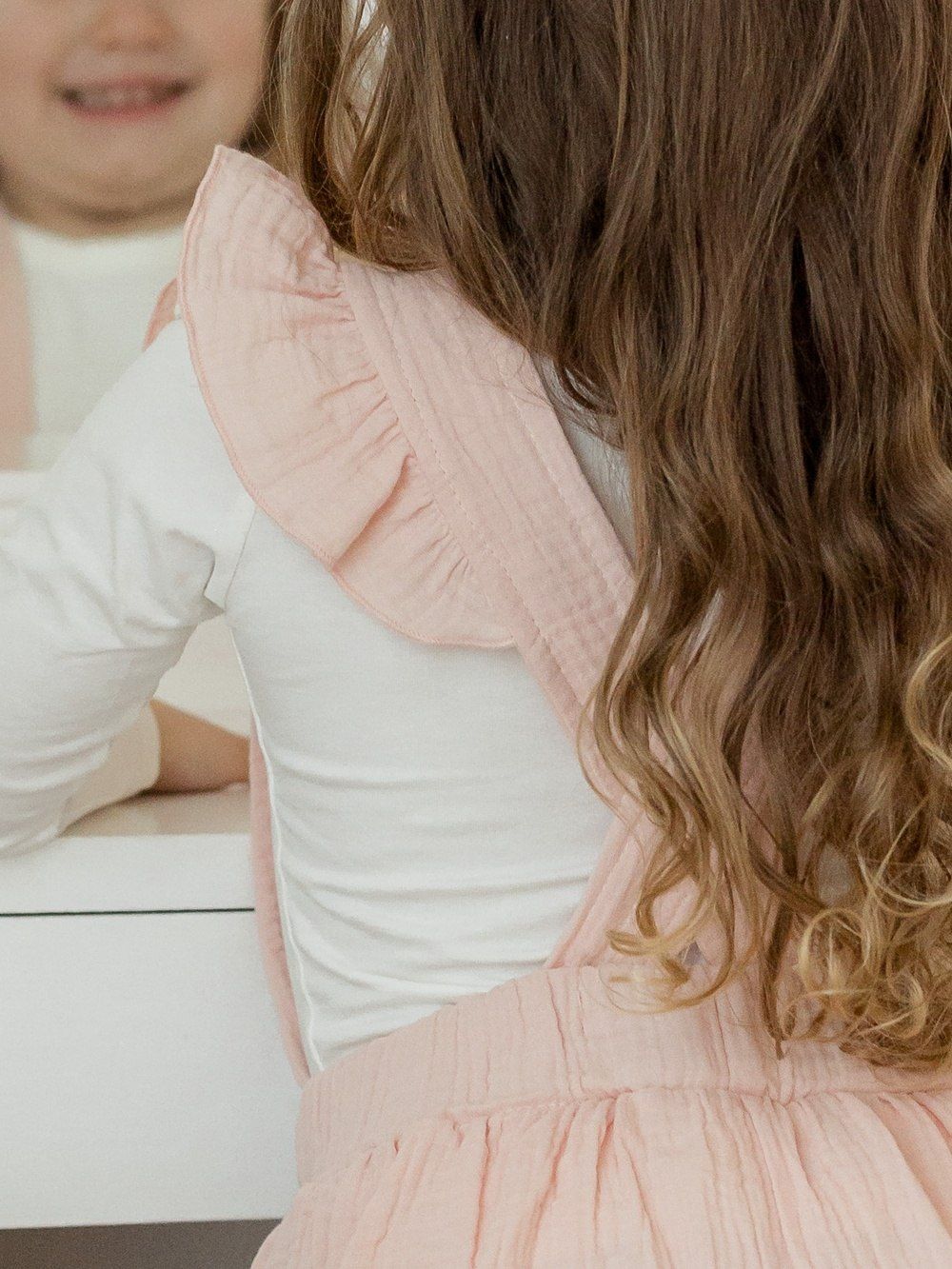 Sukýnka, kterou si dívky zamilují. Šle jsou doplněny o milé volánky. Zapínání je na předním díle na dřevěné knoflíky. Sukýnka je řasená, aby se krásně zatočila. Naleznete ji v jemné růžové i tmavší fialové barvě.