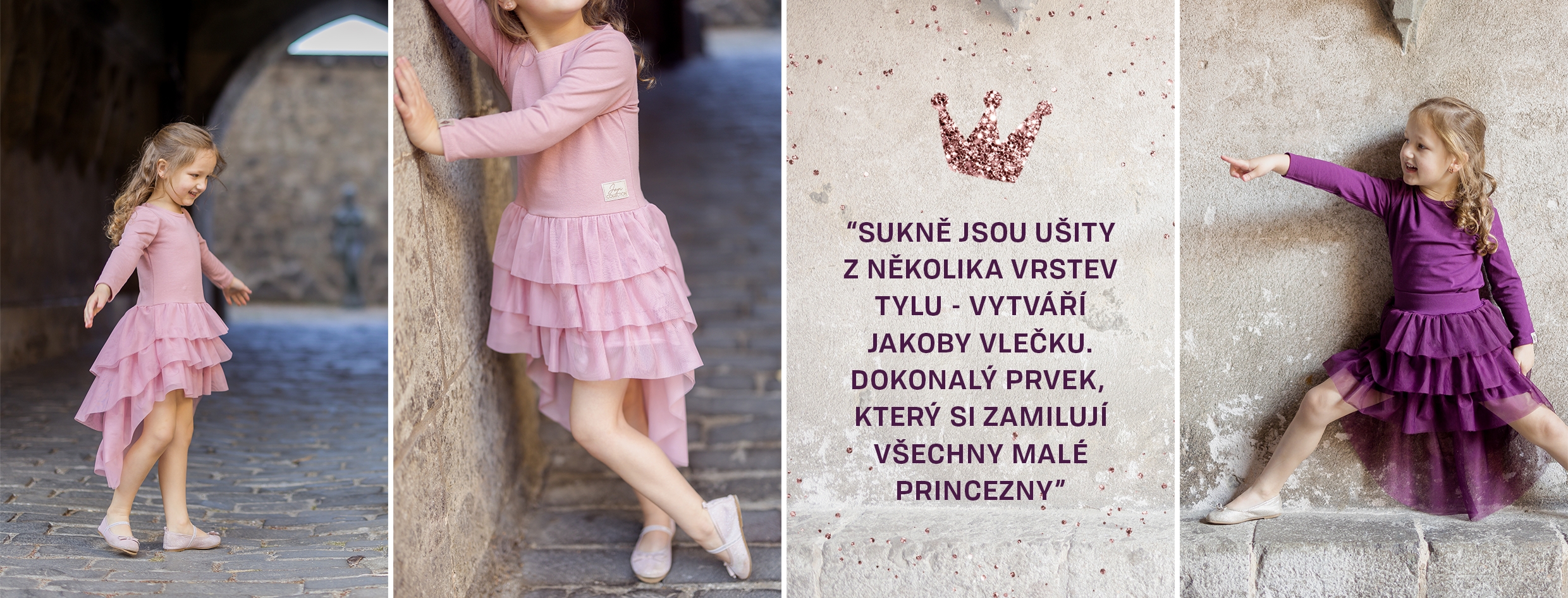 Tato kolekce vznikla na základě kolekce TUTU. Byly to nadýchané dívčí tylové sukýnky. Střihy a provedení se Vám líbily. Rozhodli jsme se letos kolekci s tutu sukýnkami rozvinout.Upravili jsme střihy sukýnek a šatů. Sukně jsou ušity z několika vrstev tylu, který je střižen vzadu do půloblouku. Každá další vrstva je o něco delší. Vytváří jakoby vlečku, kterou si dívky skutečně užijí při točení a procházení. Bude za ní vlát jako skutečné princeznovské šaty.